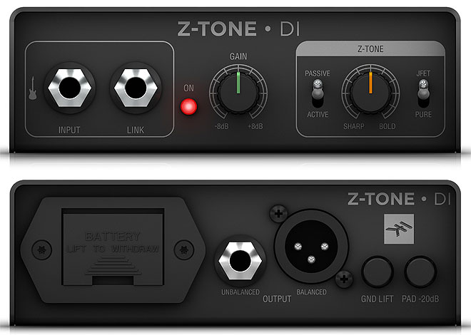 このほか、出力先の入力段に余裕を持たせる20dBのパッドスイッチ、ハムノイズを抑えるグランドリフトスイッチ(バランス出力用)を装備。出力は、1/4インチ標準フォーンアンバランス出力とXRLバランス出力(同時出力)を備え、Z-TONE回路後の信号を取り出すLINKアウトによりアンプなどに信号を同時送出可能だ。本体はステージ上の使用にも耐えうる堅牢な金属製シャーシを採用している。
