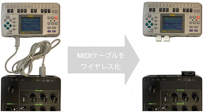 ▲MIDI機器の一方に白いアダプター、もう一方に黒いアダプターを接続することで、IN/OUTの双方向通信が可能。今となっては太くて取り回しが面倒なMIDIケーブルをなくすことができる。