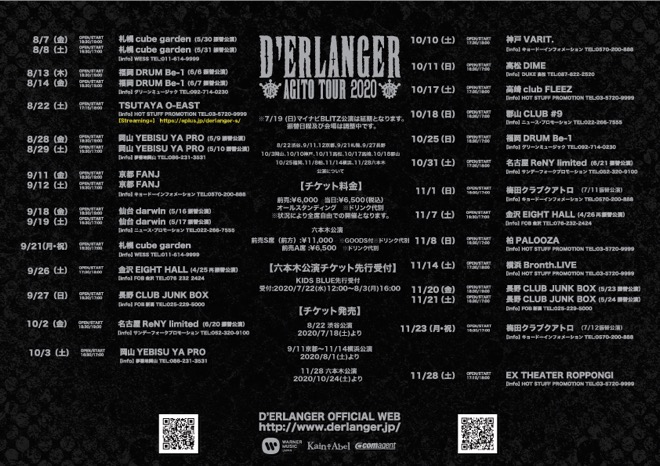 ツアー<D’ERLANGER AGITO TOUR 2020>は、4月2日の金沢公演を皮切りとした全17公演が予定されていたが、新型コロナウィルス感染拡大に伴う緊急事態宣言の発令を受け、全ての公演が延期となった。その振替公演に加え、秋ツアーの日程が追加されるなど、8月7日の札幌cube gardenから11月28日の東京EX THEATER ROPPONGIまで、全30公演のロングツアーとして<D’ERLANGER AGITO TOUR 2020>が開催される。