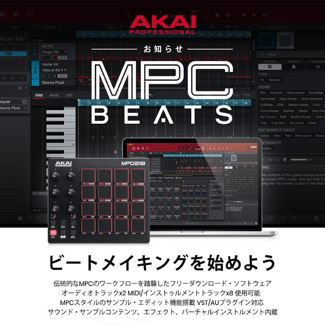 伝統のMPCハードやMPC2ソフトウェアの優れた部分を取り入れた「MPC BEATS」は、Akai Professionalウェブサイトから無料でダウンロード提供され、誰もが高品質のMPCワークフロ ーを体験できるようになる。