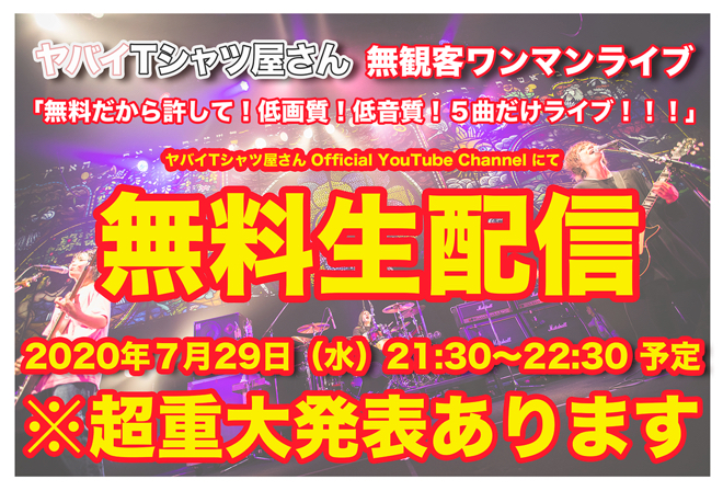 ヤバイTシャツ屋さんが、7月29日(水)に無料生配信ライブ<ヤバイTシャツ屋さん 無観客スタジオワンマンライブ「無料だから許して!低画質!低音質!5曲だけライブ!!!」>を行うことを発表した。
