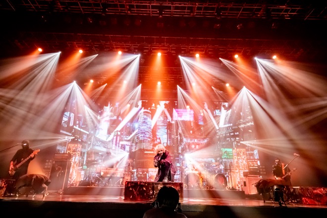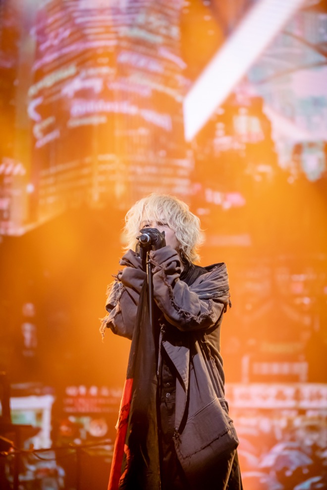 そして19時14分。いよいよHYDEのステージが幕を開けた。バックドロップはHYDE自身の構想による近未来の架空都市“NEO TOKYO”をコンセプトにしたもの。2019年の<HYDE LIVE 2019>や幕張メッセの<ANTI FINAL>を思わせる仕様だ。マスク姿のギター、ベース、キーボード、ドラムといったバンドメンバーがHYDEを中心に取り囲むような構図に、いつものステージが帰ってきたという高揚感が沸き上がる。