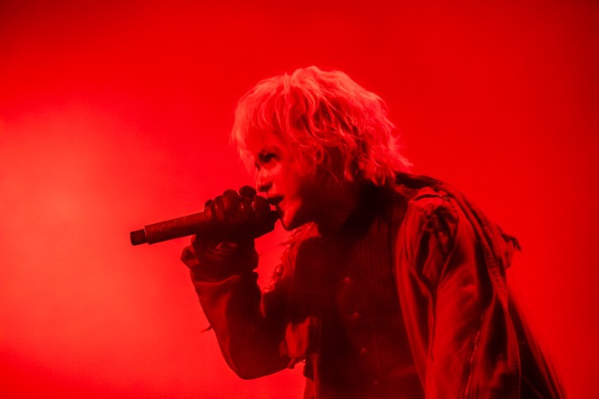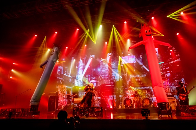 そして、HYDEの耳に確かに響いているであろうオーディエンスのシンガロングに「そう、そう。その調子。うるさいキミたち」とジョークを飛ばし、「次、みんなで叫ぶよ! Are you fuckin’ ready? お茶の間!」と煽って「ANOTHER MOMENT」へ。同曲では<ANTI FINAL>幕張メッセ公演同様に、巨大なエアーダンサーが出現する演出がステージを派手に盛り上げた。HYDEは寝転んで宙を見上げて歌ったかと思うと即座に身を起こし、シンガロングを促し、マイクを向けて笑顔を見せる。