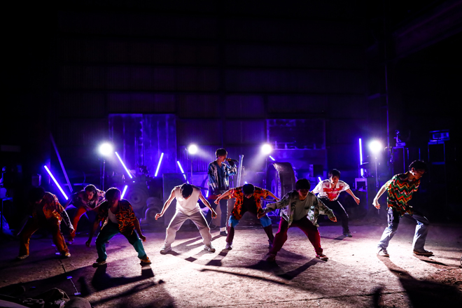 一転、前回の配信ライブで初披露されたセルフタイトルの新曲「SUPER★DRAGON」を爽快に叩きつけ、疾走感たっぷりのサウンドで昇り龍の勢いを彷彿させると、曲後半では紫のスモークをハンドレーザーの緑の光で切り裂いて、“俺達が時代を変える”とエモーション全開に。さらに、松村がデスヴォイスを放つゴリゴリのメタル曲「BADASS」では、工場内に散らばるメンバーをカメラが次々に追いかけ、エネルギーを全放出して歌い踊る彼らを接写する。そこから初期曲「The Survivor」に雪崩れ込み、噴き上がる炎が彩るダークな世界から、光の中へと飛び出してゆくドラマティックな展開も鳥肌モノ。ダイナミックなフォーメーションダンスを繰り出し、“生き残るのは俺たちだ”と拳を突き出して決意を新たにする9人の姿は実に凛々しく、「何がSUPER★DRAGONなのか、SUPER★DRAGONとはどういうグループなのかを、今回は空間全体で皆さんに伝えたかった」という古川のMCにも納得するほかない。