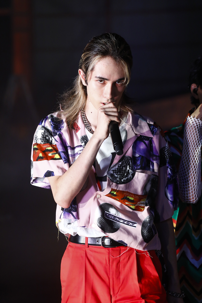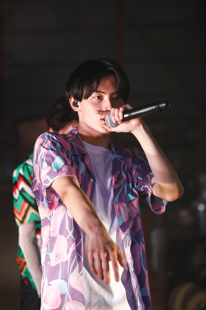 メンバーが工場内の方々に散らばって、自由自在なフォーメーションで魅せたレゲエ曲「ゲットレジャーニー」では早くもタオルをぶん回し、その後のMCで「僕が珍しく汗かいてます!」と柴崎楽が報告したほど。そして「ここが俺たちの秘密基地です」と古川が告げた通り、以降、魅惑の空間が次々に出現してゆく。“君”への情欲を全英詞でぶつける「BLOODY LOVE」では、セクシーなボーカルを聴かせる古川、ジャン、池田彪馬を筆頭に、艶めかしく蠢く9人に万華鏡を思わせるプロジェクションマッピングが被さって、秘めておきたい妖しのムードを演出。雑踏の音から松村和哉のセリフで導いた「My Playlist」も、9人が工場内で1階と2階の二手に分かれる立体的なフォーメーションで、画面は一つしかないのに“目が足りない!”という状態を引き起こしてしまう。