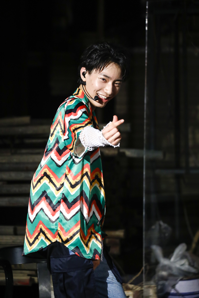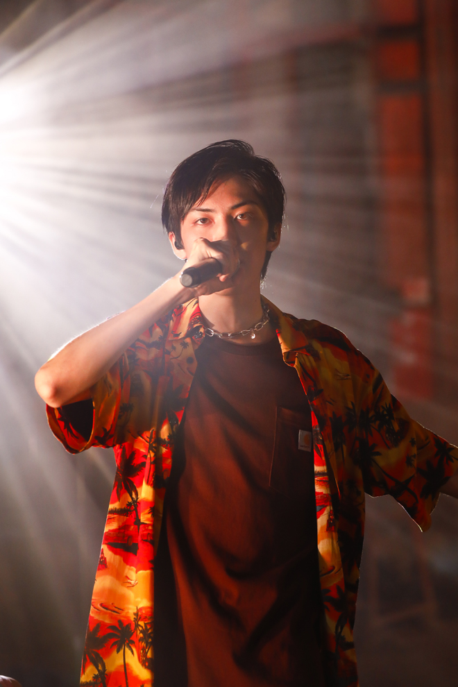 開催に先立ち、メンバーが「廃工場というシチュエーションを最大限に活かした、生配信でしかできない演出で驚かせる」と断言していた言葉は、幕開けから現実のものとなった。開演時刻になると、なんと車で現場に乗りつけた9人が画面に映り、ニヤリと手招きする志村玲於から順に一人ずつ降り立って、重低音響く「Strike Up The Band」でライブをスタート。薄暗がりの中、廃工場の荒んだ光景とブチ上がる炎をバックに、力強く拳を掲げてステップを踏む9人の男らしさときたら半端なく、初っ端から釘付けになる。「画面の向こうも声出していこうぜ!」と煽ったジャン海渡は、続く「hide-and-seek」でも高速ラップを放ち、鋭い眼差しでボーカルを取る古川毅と絶妙なコンビネーションで魅了。全員柄シャツにカラーパンツという治安の悪そうな出で立ちも、今日この場所にこそふさわしく、そこに重なる幾何学模様のライティングと相まって、底知れぬダーク&ディープな世界観を醸し出してゆく。