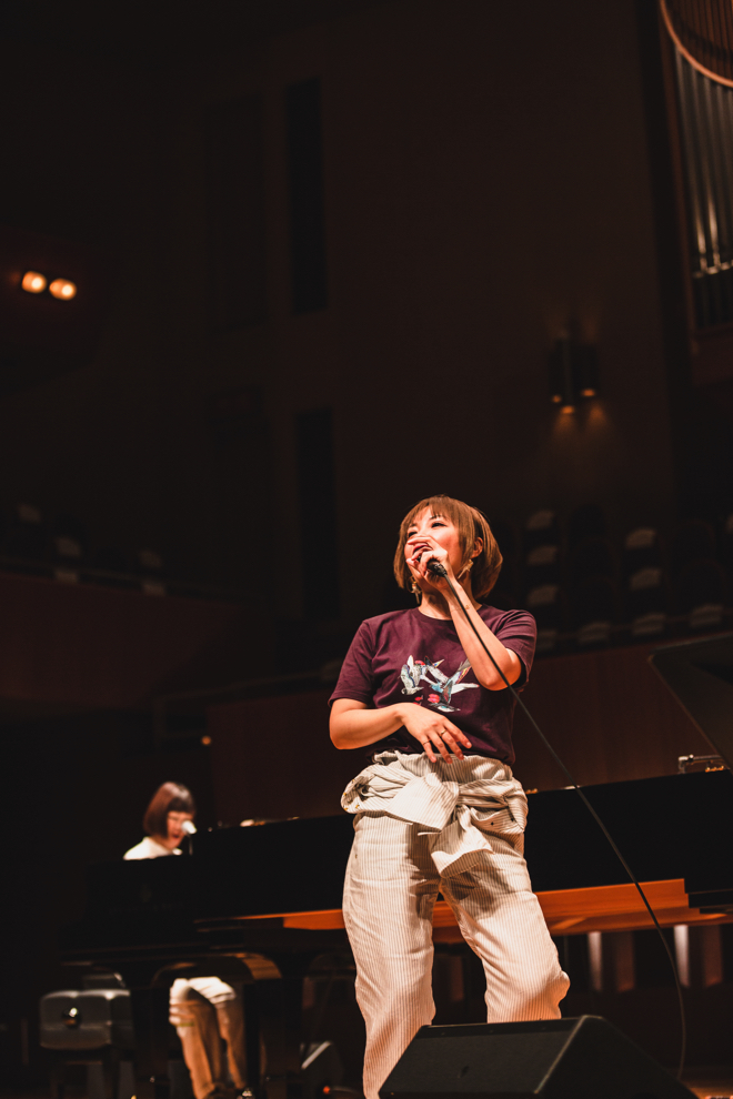 エレガントなベージュのレース柄のワンピース姿でステージ袖から静かに登場した2人が深々とお辞儀するところからステージは始まった。ファンからのリクエストも多かった2001年のアルバム収録曲「スープ」、そしてインディーズ時代の名曲「雨の雫」で静かにスタート。続いて2001年のヒット「やっぱり!」で演奏はテンポアップして2人の表情にもリラックス感が戻ってきた。