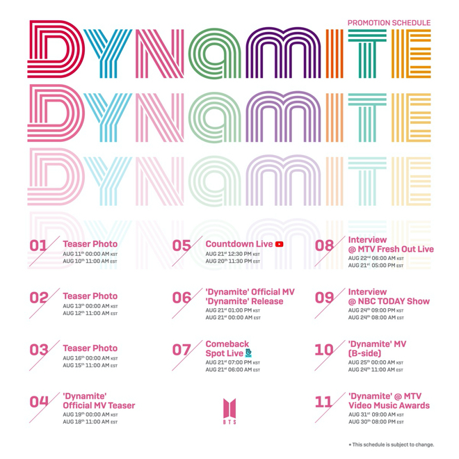 BTSが、8月21日(金)にリリースするニューシングル「Dynamite」のプロモーションスケジュールを公開した。