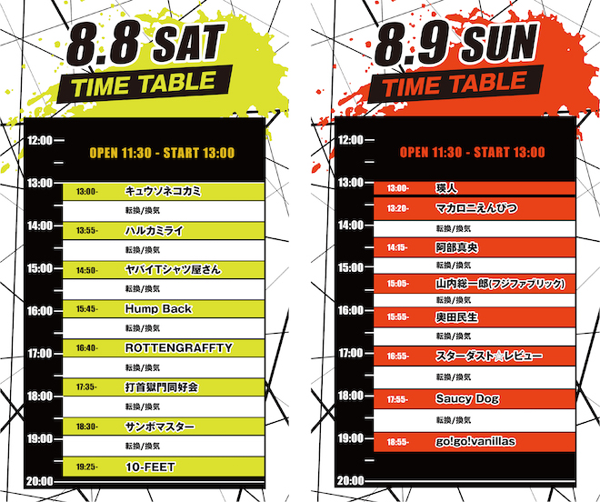 出演アーティストは全16組。8月8日は、キュウソネコカミ、ヤバイTシャツ屋さんらが名を連ね、トリは京都のロックバンド10-FEETがつとめる。