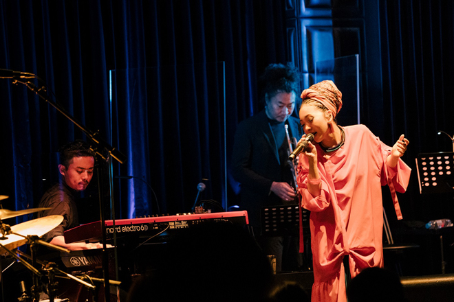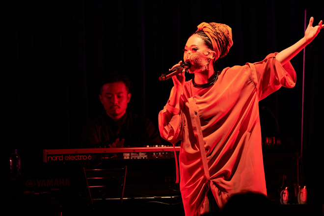 Blue Note、Billboard Liveは共にレストランスペースを兼ねた空間であり、通常のホールより安全なソーシャルディスタンスが確保できるという。さらに客席を減らすことや、入場時の検温、手指消毒など考えうる限りの感染症対策を万全に行なったうえで安全に音楽を楽しめる環境を作り出した。先にステージインしたバンドのアンサンブルに迎えられMISIAが登場すると、オープニングナンバーは、今年1月&2月の大阪城ホールと横浜アリーナのライヴでもオープニングを飾った「CASSA LATTE」で幕を開けた。会場からは声援の代わりにハンドクラップが咲き乱れる。そしてMISIAは、衣装に合わせたデザインのマスクを着用し、ただでさえ難易度の高い歌唱をパフォーマンスしたのであった。息が乱れることなく幅広い音域を行き来するパフォーマンスは、コロナ禍の今だからこそ目撃できる貴重なパフォーマンスと言える。そのMISIAのボーカルを支えるのは、ジャズ・トランペッター黒田卓也を中心とした特別編成によるバンドだ。個々の凄まじい力量と遊び心を感じさせる演奏が初っ端から弾ける。