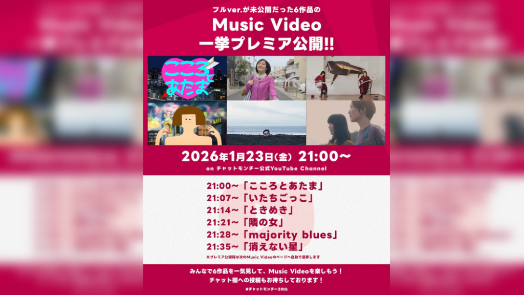チャットモンチー、YouTubeにてフルバージョン未公開曲のMVを一挙公開決定