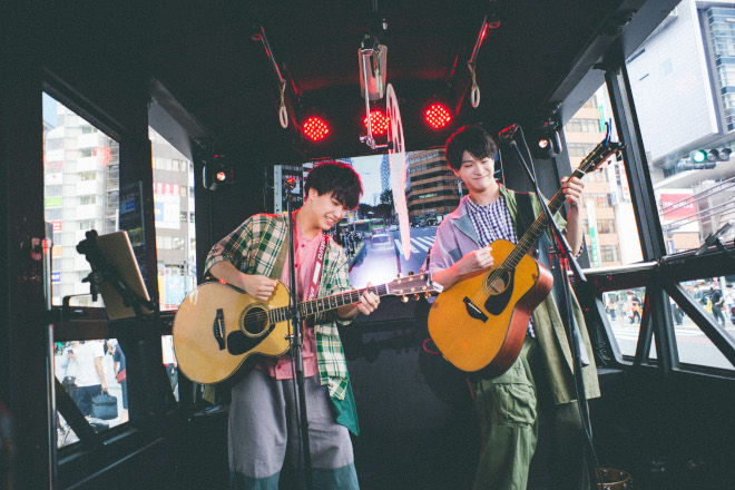 さくらしめじを乗せたLIVE BUSは、LINE CUBE SHIBUYA(旧・渋谷公会堂)付近から出発。どんな状況下に置かれても歌っていくんだという意志が込められた「朝が来る前に」を歌い始めると、歩行者の視線が一気に集中。彪我が「渋谷の街のみなさ~ん。どうもこんにちは、さくらしめじで~す」と明るく挨拶。スクランブル交差点では、フォークデュオの新境地に挑んだ4つ打ちのロックアンセム「My Sunshine」を高らかに響かせた。