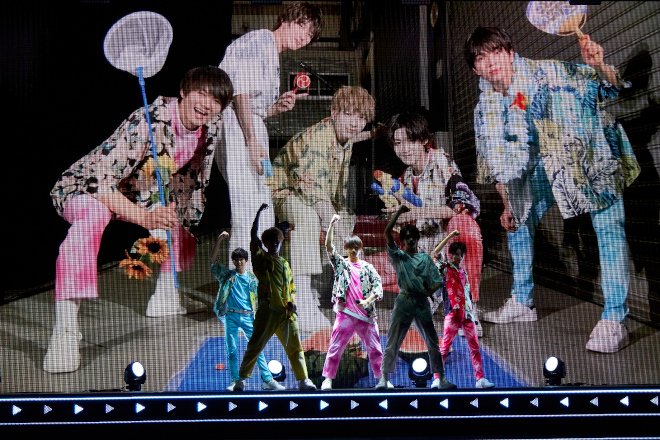 メンバーはアロハ姿で(明るく元気な笑顔を浮かべ)倉庫のようなスタジオに登場。オープニングを飾った青春ロック「かすかに、君だった。」で切なくもクールなダンスで魅せたあと、サマーソングを連発。9thシングルのカップリング曲でライブ初披露となるEDMポップ「Gotta Get Up」に続き、お祭りソング「夏味ランデブー」では、スタジオに用意された水鉄砲、シャボン玉、うちわ、虫網などで遊びながら夏気分をアップさせ、目隠しをした吉田はメンバーの誘導でスイカ割りにもチャレンジ、見事に大成功。メンバーから歓声が上がる中、吉田は「五右衛門か、俺?」と困惑しつつ、そのまま巨大なLEDスクリーンが設置されたステージへと上がり、「完全S.S.D!」では楽しく賑やかにパフォーマンスし、吉田はキレのあるソロダンスで盛り上げた。