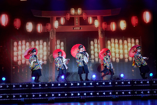 最初のMCではリーダーの吉田が「夏っぽい雰囲気だったり、今まで見せたことのないM!LKをいろいろ見せていこうと思うので楽しみにしてください」とライブに向けた意気込みを語り、塩﨑の「次の旅にいきましょう。アテンション・プリーズ」という言葉を合図に、舞台は、大正ロマンの世界へと突入。制帽を被り、カラフルな和柄の羽織を身につけたメンバーは、振り向きざまに流し目を決め、鳥居や花火などの映像をバックに、和風にアレンジされた「パッパラ・シュビドゥ・ヴァァァァァァァ」で和傘を使って舞った。さらに、制帽と羽織を脱ぎ、ロングジャケット姿になったメンバーは、中世ローマ帝国時代のコロッセオへと飛び、山中の大人っぽくセクシーな表情から始まった「Amore~僕は君に愛を叫ぶ~」では、マタドールのような情熱的な歌声を聴かせ、吉田が「アモーレ!」と絶叫。生のバイオリン演奏を挟み、刹那の今を切り取ったバラード「君がくれた宝物ならココにある」では、儚くも凛とした歌声を重ね、視聴者の涙を誘った。