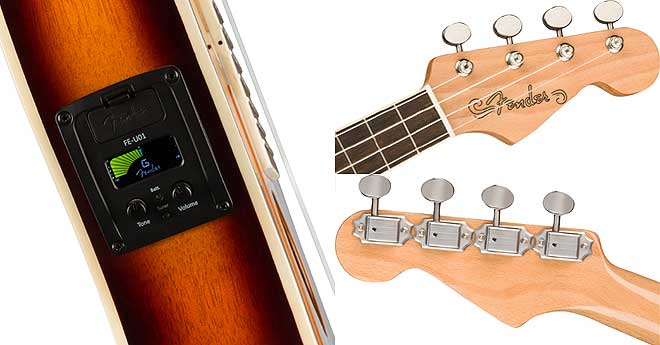 ▲チューナー内蔵のオリジナルプリアンプを搭載。コントロールはトーンとボリュームの2ノブ。ヘッドストックはそれぞれがモチーフとしたモデルと同じ形状となっている。写真はStrat Uke。