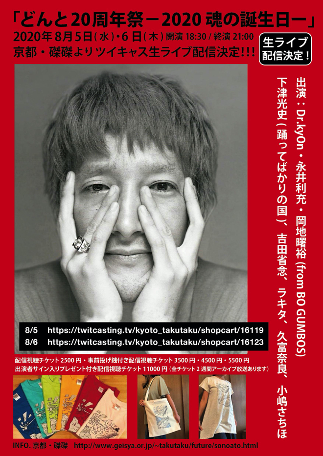 2000年1月、37歳の若さで天国へ旅立っていったどんと。今回のイベントでは“魂の成人式”のテーマのもと、Dr.kyOn、永井利充、岡地曙裕、ラキタ、久富奈良、小嶋さちほ、吉田省念、下津光史(踊ってばかりの国)が京都・磔磔に集結する。