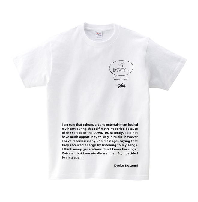 小泉今日子デザインによるスペシャルTシャツ。「唄うコイズミさん」ロゴ&会場となるVeats SHIBUYAのロゴ、さらに小泉今日子のメッセージが英語でプリントされたスペシャルな1枚。ボディカラーは爽やかな「ホワイト」、シックに着こなせる「ブラック」の2色。