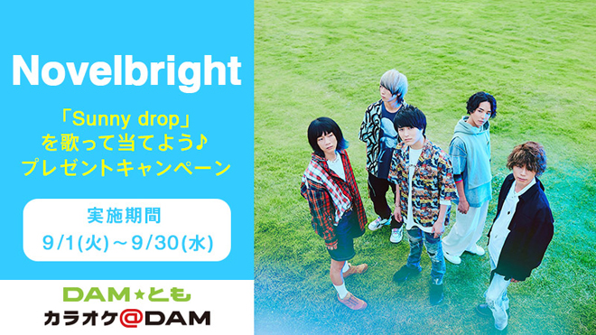 2020年8月17日にユニバーサルミュージックよりメジャーデビューを果たしたNovelbrightのカラオケ歌唱キャンペーンが、「カラオケ@DAM」と「DAM★とも」で実施される。記念すべきメジャー1作目の「Sunny drop」を、おうちまたはカラオケ店で歌ってオリジナルグッズを当てよう(キャンペーン期間:9月1日〜9月30日)。