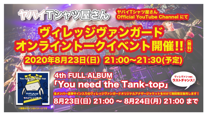 ヤバイTシャツ屋さんのニューアルバム『You need the Tank-top』の発売を記念したオンライントークイベントの第3弾<ヴィレッジヴァンガードオンライントークイベント>が、8月23日(日)に公式YouTubeチャンネルで開催されることが決定した。