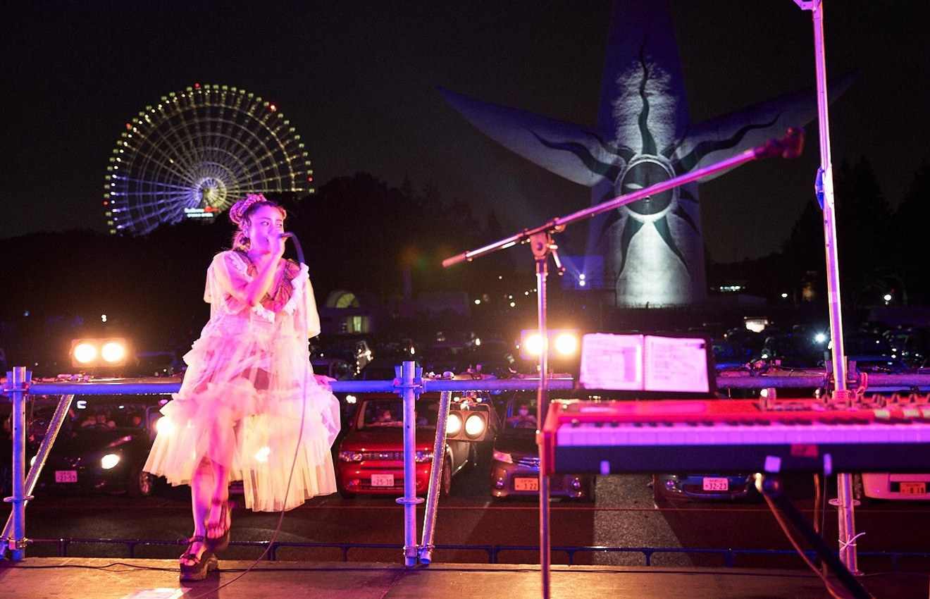 2日目のトリ、Charaのステージはとにかく愛で溢れていた。「ハイビーム、ちょうだーい♪」、Charaの“ドライブイン”な呼びかけで「Junior Sweet」からライブがスタート。オーガンジーの衣装をひらつかせ、甘い歌声を届ける彼女の姿を少しでも近くで感じたいと、ハンドルを抱えて前のめりでステージを魅入る観客の姿も見える。「やさしい気持ち」では、韻シストのメンバーも参加しているCharaバンドが骨太なサウンドを鳴らす中、感情たっぷりに歌い上げる彼女の姿を映すスクリーンには、大きくそびえる太陽の塔、たくさんの車と眩いパッシングが映り、普段のライブでは見ることができない美しい景色が広がっている。今年でデビュー29周年を迎えるCharaもこの日が久しぶりの生ライブ。高まる感情は留まることがなく、「ミルク」「Swallowtail Butterfly~あいのうた~」など様々な楽曲でステージを駆け抜け、2日目のステージが終了。最後まで愛で溢れたステージに大きな拍手ならぬ、パッシングがステージを照らしていた。