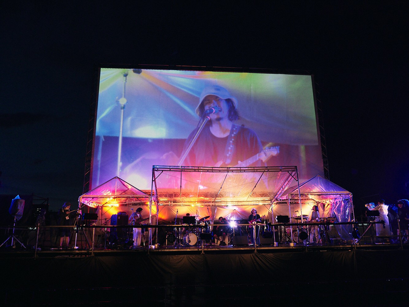 2日目のトップバッター、Tempalayは浮遊感たっぷりな「脱衣麻雀」から変幻自在なサウンドを打ち鳴らしていく。生ライブならではの迫力はそのままに、カーラジオならではの良い感じの音の雑味も加わって独特な風合いを感じさせてくれる。「未知との遭遇」「どうしよう」と続いたところで、突然の雷雨によりステージが一旦中断に…。観客はカーラジオから、急遽、豪雨中断中のピンチヒッター登場となったDJ HASEBEのDJプレイを聴きながら、雨雲が過ぎ去るのを待つ。