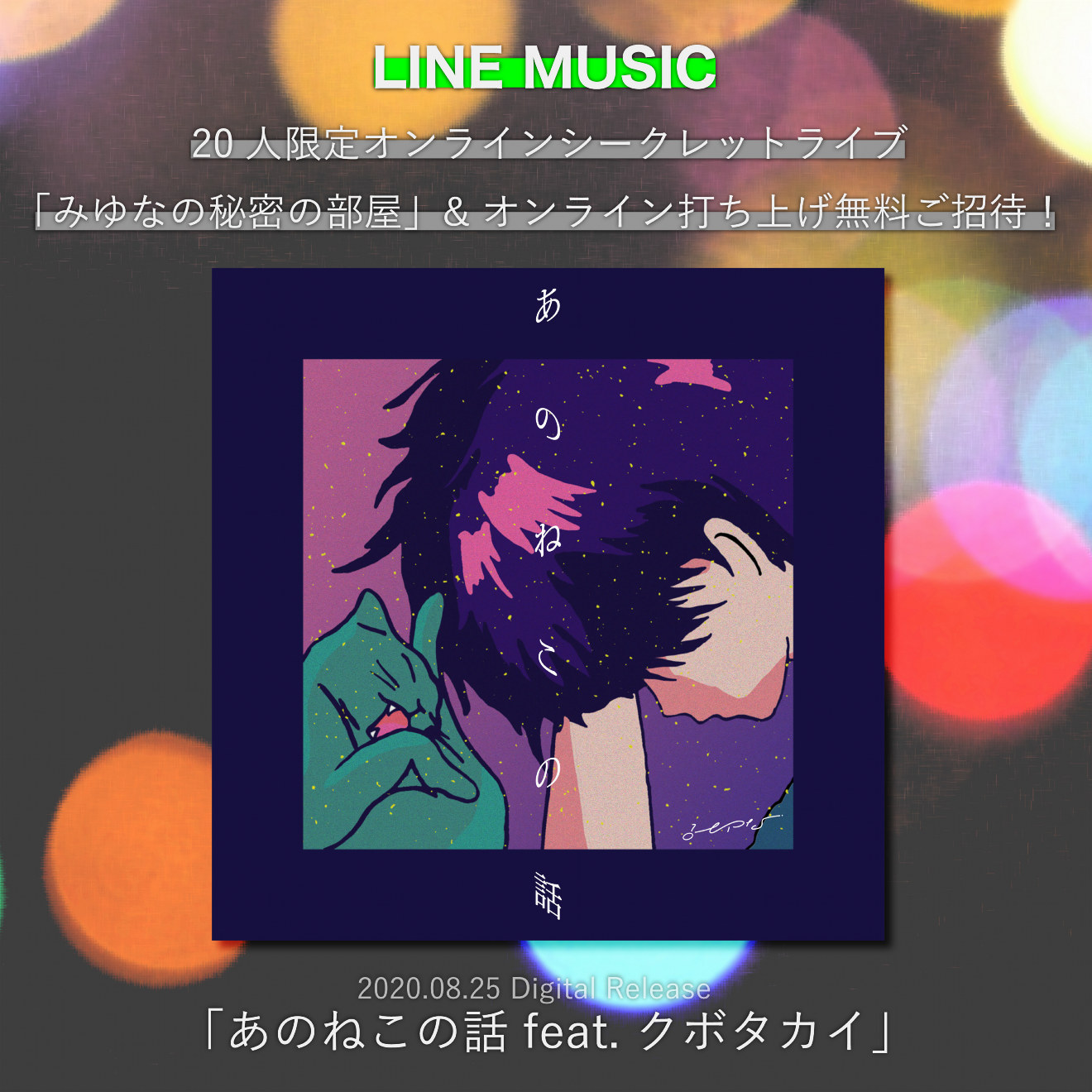 8/25(水)リリースみゆな配信シングル「あのねこの話 feat. クボタカイ」をLINE MUSICにてフル尺再生でたくさん聴いていただいた方の中から再生回数上位20名様が当選となり、オンラインシークレットライブ「みゆなの秘密の部屋」&オンライン打ち上げに参加できます。