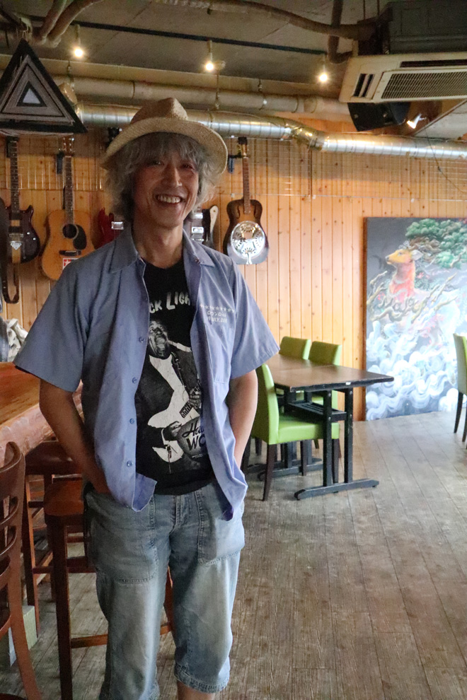 1961年宮崎県生まれ。教師をしていた親父がアタラシモノ好きで、物心付いた頃には家にエレキ・ギターがあった。小学校低学年の頃ステレオにコードを差し込んでギターに触ったりしていた。4つ上の兄貴の影響で音楽に早く目覚め、グランド・ファング・レイルロードのマーク・ファーナーの真似して上半身裸でエア・ギターしたり。古井戸やRCサクセションを知るきっかけも兄貴だった。初めてレコード屋さんから持って来てしまったのは舟木一夫のシングル「高校3年生」だった(次の日お袋が謝りに行った)。10代になるとラジオ/文化放送“POPS 20”(DJ/みのもんた)を楽しむようになった。毎週のランキングと新譜をしっかりノートに書き込んでいた。ジョン・レノンの「イマジン」が紹介された次の日には小遣い持ってレコード屋に走った。最初はジョン、その後バングラデシュ・コンサートに触れてジョージ・ハリスンが好きになった。初ストーンズは「悲しみのアンジー」、もうその頃ブルースを聴いていたからその時は彼らのことはそんな好きにはならなかった(笑)。ブルースは小6からで最初はB.B.キングを聴いたけどあまり入りこめなかった。ブルースに本格的に目覚めたのはライトニン・ホプキンス、カントリー・ブルースの方がフィットしたんだ。小6のその頃からアコーステック・ギターを始め、曲作りもしていた。初めての作品は「もぐらのうた」、今でも譜面がある(驚)。