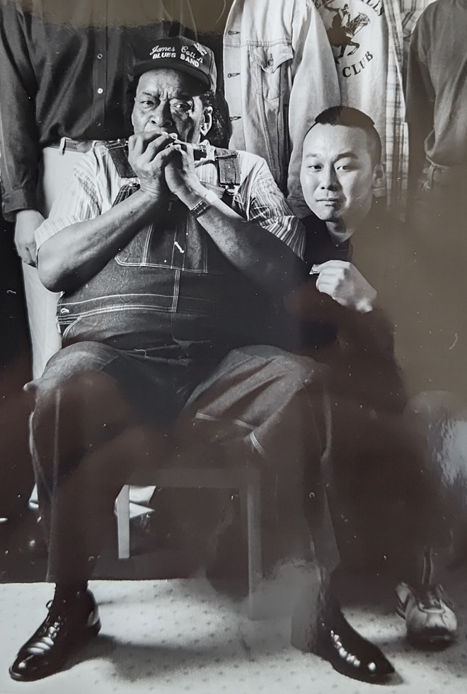 22歳の時にブルースの本場で武者修行。いきなりブルース・クラブB.L.U.E.Sに行ってジミー・ジョンソンのライヴに飛び入り。ヨーロッパ人のファンに折角シカゴに来たのに中国人の演奏なんか聴きたくネェと怒られた。でもそんなことにめげずに毎晩いろんなクラブに出没してセッション。数か月シカゴに滞在した。帰国後も多くのミュージシャンのライヴに乱入した。マディの本を読むと、クラブに乱入して大受けすると翌日からレギュラーだと著してあるのでそれを俺は信じ実行していたのだ。95年、自由が丘Mardi Grasで演奏するYANCYのステージに乱入、以来彼とはレコーディング&ライヴしている。