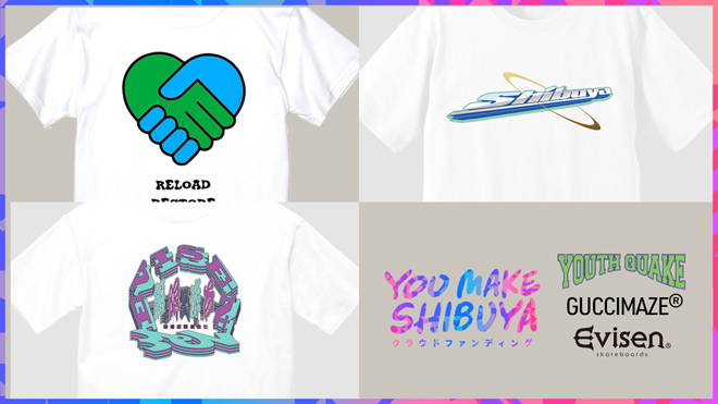 <YOU MAKE SHIBUYA クラウドファンディング>、「GUCCIMAZE」「EVISEN SKATEBOARDS」「YouthQuake」によるオリジナルデザインTシャツの新リターン登場