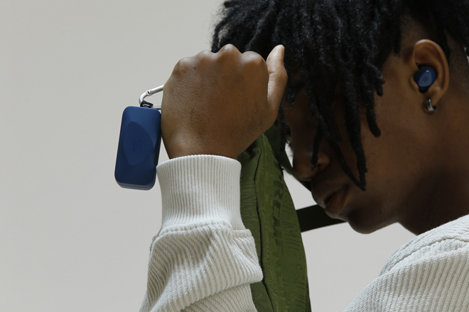ケースから取り出すだけでデバイスとつながるオートペアリングや外部音を取り込むオーディオトランスパレンシー機能も搭載。連続再生時間は約6.5時間。リュックなどにかけられるカラビナフックも付属。全てのアクティブ系ユーザーの為にデザインされた完全ワイヤレスイヤフォンだ。
