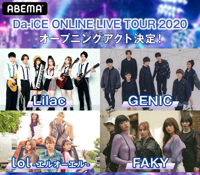 Da-iCEが9月13日に開催する<Da-iCE×ABEMA ONLINE LIVE TOUR 2020-THE Da-iCE->ファイナル公演に、オープニングアクトとしてFAKY、lol-エルオーエル-、GENIC、Lilacの4組が出演することがわかった。