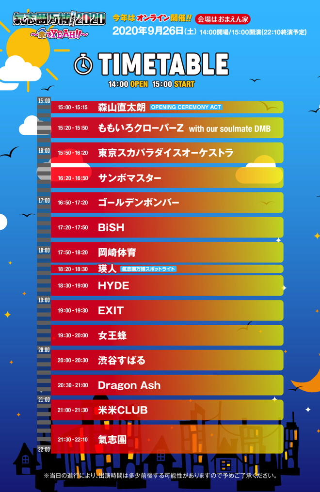9月26日(土)に開催される<氣志團万博2020 〜家でYEAH!!〜>のタイムテーブルが発表された。