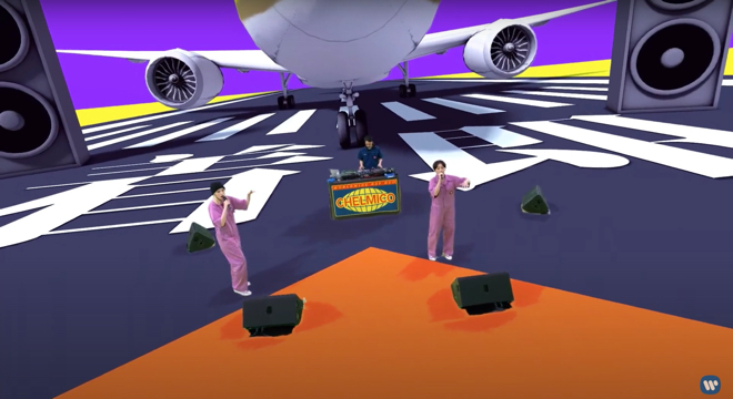 そして、楽屋からグリーンバックのスタジオに向かうchelmicoの姿が映し出され、二人がスタジオでマイクを持ち、Rachelが「Easy Breezy!」と叫ぶと、緑一色だったスタジオの背景が一気に360度、田向潤氏の手掛けるCGに早変わり。chelmicoの二人が「Easy Breezy」をパフォーマンスするなか、背景やカメラアングルがリアルタイムで縦横無尽に変化し、このイベントのタイトル通り、2次元と3次元がクロスオーバーしていく。