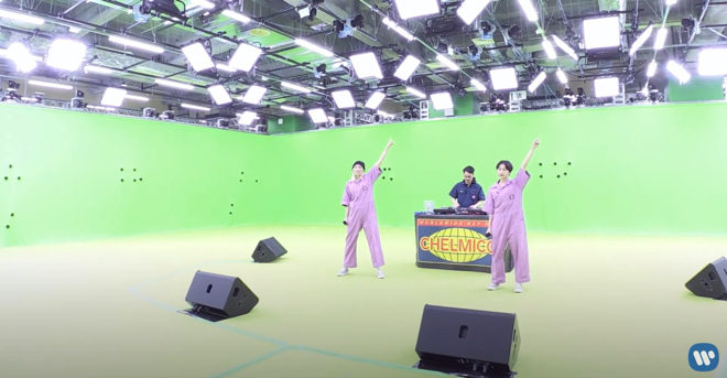 続く「Disco (Bad dance doesn’t matter)」では、床面がレコードのデザインになり、この映像エフェクトにはchelmicoの二人も「かわいい!」と大絶賛。そしてRachelとMamikoの二人もカメラを操作し、ジャンプした姿にリアルタイムでエフェクトをかけたり、カメラアングルの変更など、スタジオの技術を自分たちでも楽しんだchelmico。