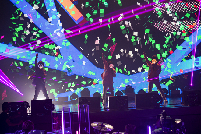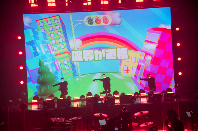ここからは、信号機組と大人組に分かれ、パフォーマンスするターン。信号機組の莉犬、るぅと、ころんは、ぶーんと言いながら、ポップな街の景色が流れていく「道標」、ころんの妄想上の恋を歌った「咲かせて恋の1・2・3!」を遊び心を満載にして届ける。それに対し、大人組のジェル、さとみ、ななもり。は、信号機組に負けないくらいに明るく「キングオブ受動態」を歌って見せては、ここぞといわんばかりに、「脳内ピエロ」で時に虚しい感情を全身で表現し、ムーディーで流麗な歌声を解き放つ。