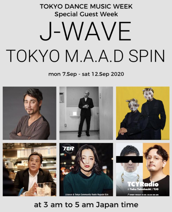 <TOKYO DANCE MUSIC WEEK 2020 -ONLINE->(※以下、TDMW2020)は、J- WAVE「TOKYO M.A.A.D SPIN 」(27:00〜29:00 放送)、S/U/P/E/R DOMMUNE と、いとうせいこうの分散型オンラインフェス<MUSIC DONʼT LOCK DOWN(#MDL)>の3つのメディアを軸に、ラジオ・オンライン・配信で9月7日より1週間、 渋谷区〜港区エリアを中心に実施される「ダンスミュージックの祭典」となっている(7日からのコンテンツはHPを参照のこと)。