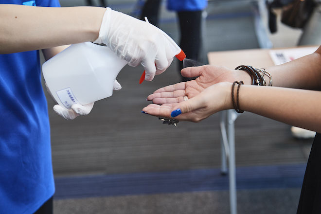 係員により手指の消毒を実施