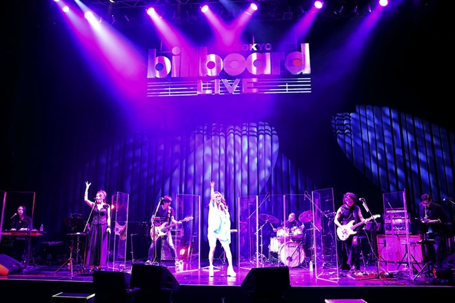 8月27日19:30、アカウントサイトには過去のMV集が流されていた。ふんだんに現れる1990年代の懐かしい映像が、これから始まるライブへの期待感を高める。右手を高々と上げて歌う大黒の写真が掲げられたサイト画面を注視しながら開演を待っていると、定刻20:00に画面がライブ会場であるビルボードライブ東京の映像へと切り替わった。ステージ上にはすでにバンドメンバーがスタンバイ。通常のライブと違い、スタッフは全員がマスクとフェイスシールドを装備し換気と消毒を定期的に行うなど、厳重な感染防止対策の中でのライブとなる。各メンバー間がアクリル板で仕切られ、ソーシャルディスタンスも万全。そんな光景の中、ついに大黒摩季がステージへ登場した。ペパーミント・グリーンの爽やかに揺れるポンチョに、白のハーフパンツといった夏らしい出で立ちで、「まずは楽しもう」と!第一声。