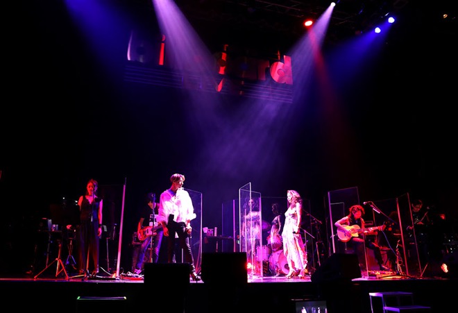 長身イケメンの當間ローズがステージに登場した。生まれはブラジル、静岡育ち、母がブラジルとスペインのハーフ、父がイタリアと日本のハーフのスーパーラテンMixtureな彼は、まさしく“ラテンの貴公子”たる風貌ながら腰が低い。そんな若い彼との切なく情熱的なデュエットに、“また一つ新しいタイプのスタンダード曲登場か”と思わされた。二人のセクシーなラテンダンスもみどころ。感染防止対策のために立てられたアクリル板越しのやりとりは“恋のソーシャルディスタンス”であり、なんとも悩ましい楽曲世界を視覚化した。