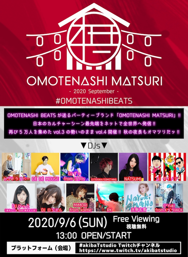 <OMOTENASHI MATSURI -2020 September->は、“J-POPをビートにのせて世界中の人々をおもてなし”をコンセプトに、日本ならではのアニメソングとダンスミュージック&クラブカルチャーの最先端を世界へ届けるプロジェクト『OMOTENASHI BEATS』によるDJパーティーイベント。6月7日に行われた初回からビュワー合計10万人を集め、Twitterのトレンドでは最高5位を記録するなど、その盛り上がりに大きく注目が集まっている。
