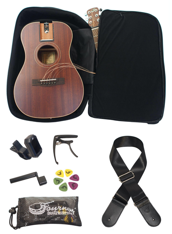 ネックを取り外して付属のバックパックに収納できるトラベルバッグシリーズは、移動手段を選ばず楽にギターを持ち運びができる。直方体に近いバックパックは電車の網棚や駅のコインロッカーにも収まり、部屋の中でも場所を取らないので、いつでもどこでもギターの練習をすることが可能だ。そのトラベルバッグギターの人気商品に、必須アイテムのチューナー・ストラップ・カポタスト・ストリングワインダー・ピックを組み合わせて、すぐにギターを始められるお買い得なセットになった。