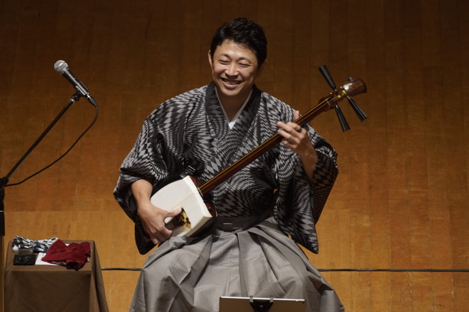 津軽三味線では珍しいクラシックホールでのコンサート。バチを三味線の胴に打ちつけるアタック音を活かした津軽三味線独特の響きだけでなく、時に柔らかく、時に切なくしみじみと聴かせる。弱音(じゃくおん)も、左手で糸をハジく響きも一音一音クリアで美しい。なかでも「秋田荷方節」は、水が流れるように曲が流れ人々の心を捉えた。そして出身地の茨城県民謡をしみじみと弾き唄う唄声に惚れ込んだ人も多いだろう。