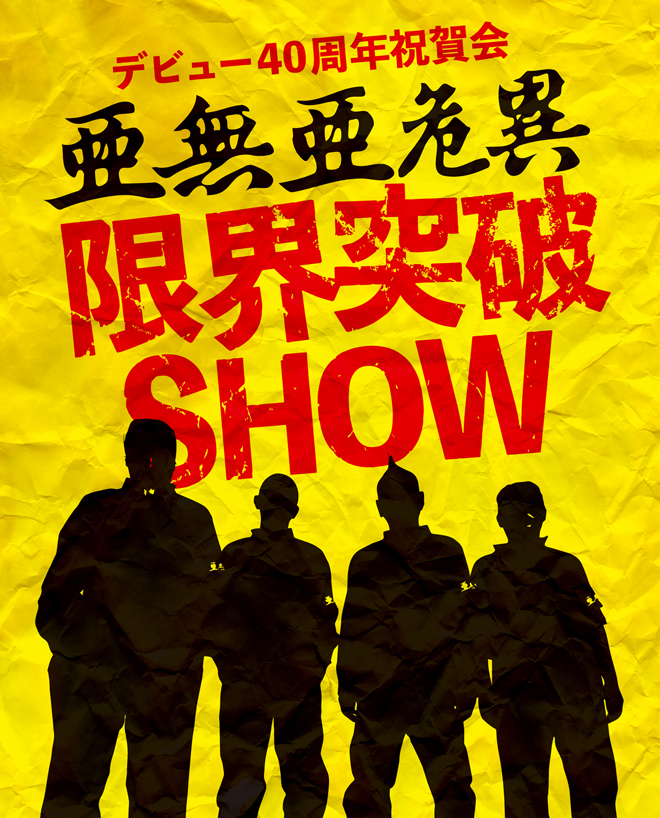 亜無亜危異が10月17日、18日に東京・神田明神ホールで開催予定だった<パンク修理ツアー2020>東京公演の内容を変更し、<デビュー40周年祝賀会 限界突破SHOW>として開催することを発表した。