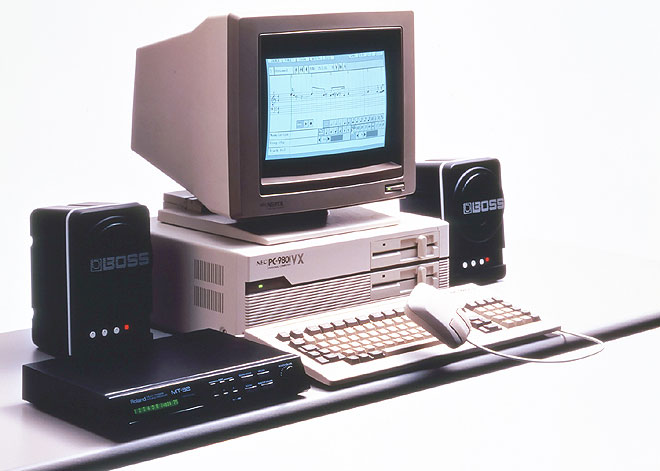 ▲ローランド『ミュージくん』。パソコンPC-9801とのセットアップ・イメージ。