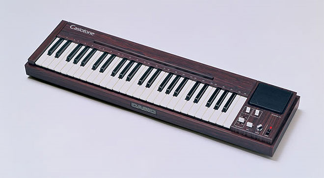 ▲カシオ計算機が楽器分野への新規参入を果たしたポータブルキーボード『カシオトーン 201』。49鍵の標準鍵盤とスピーカーを搭載。同時発音数は8音。29種類の楽器音を搭載する。