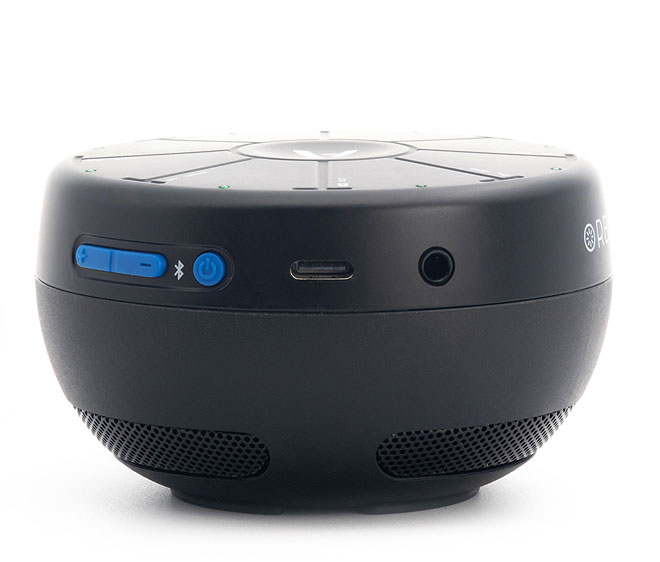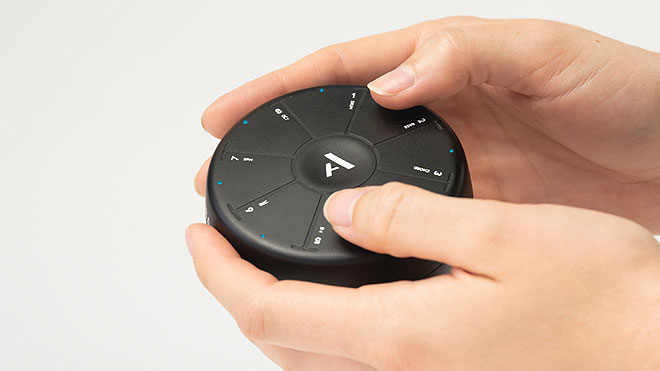 ▲球体の断面にあたる面にマルチカラーLEDとタッチセンシティブパッドを搭載。中央のAボタンと周囲の1~8を同時に押すことでモードを切り替えたり機能を選択する。