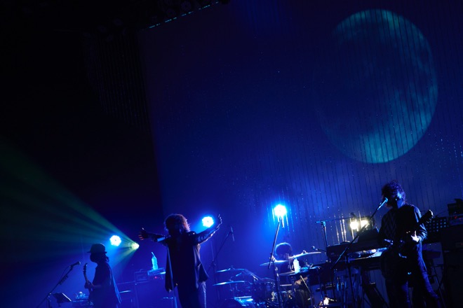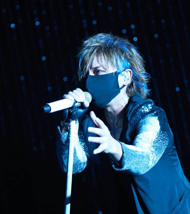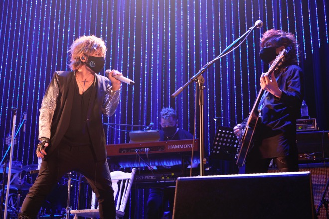いつものSE「What a wonderful world」が流れると、サポートメンバーに続いて豊田和貴(G)、松岡充(Vo)がステージに登場した。昨年のクリスマスライブ以来、約250日ぶりにステージに立つ二人。新曲「Luna」で大きな月の映像を背負い、ライブが幕開けすると、ステージに立つメンバーは全員マスクを着用したままのパフォーマンスだ。観客は自発的に着席状態のまま、任意だったがほぼ全員がフェイスシールドを着用している。規定として大声を出すことが禁止されていたため、歓声を上げることはなく、静かにペンライトを振り、ステージ上のパフォーマンスに応える。