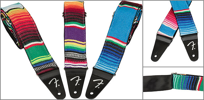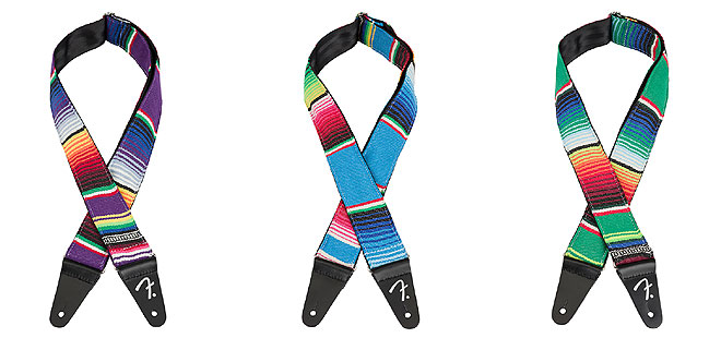 メキシコ製のブランケット生地とその大胆なパターンにインスパイアされたSerape Strapは、本物のメキシカンブランケットから製作されており、ポリエステル製のシートベルトの裏地とシルバーニッケル製のスライダーで補強されている。目を引く3種類のデザインはどれも個性的で、フェンダーのストラップならではの快適さと安全性を兼ね備えている。