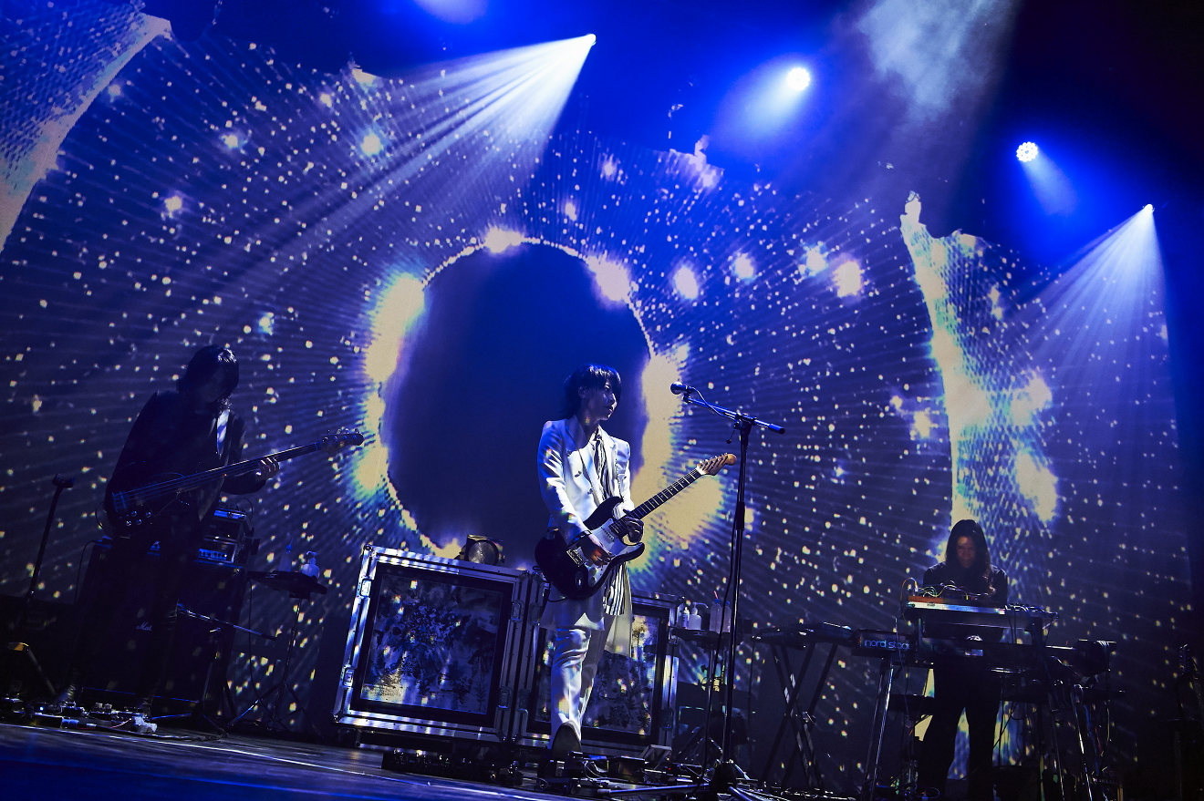 座席は感染対策に万全を期し広い間隔を取られており、観客はマスク着用のうえ発声を控えて開演を待機。紗幕越しにメンバーが登場し、純白のスーツ姿の圭が最後に現れ、ギターを鳴らす。最初の一音だけでモノクロームの世界を色付かせるような、鮮烈な始まりだった。無数の光の泡が弾けてゆく映像を背に、ゆったりと宙を泳ぐように身体を揺らしながら、最新ソロアルバム『4 deus.』収録の「empyrean.」を艶やかに演奏。紗幕が落ち、水面に反射する花の眩い映像が目に飛び込んでくると、2009年の1stソロアルバム『silk tree.』に収められている「pitiful emotional picture.」を繊細に歌い届けた。音楽だけでなく、想像力を掻き立てられる映像、照明、すべてが絡み合って圭の世界を構築していく。