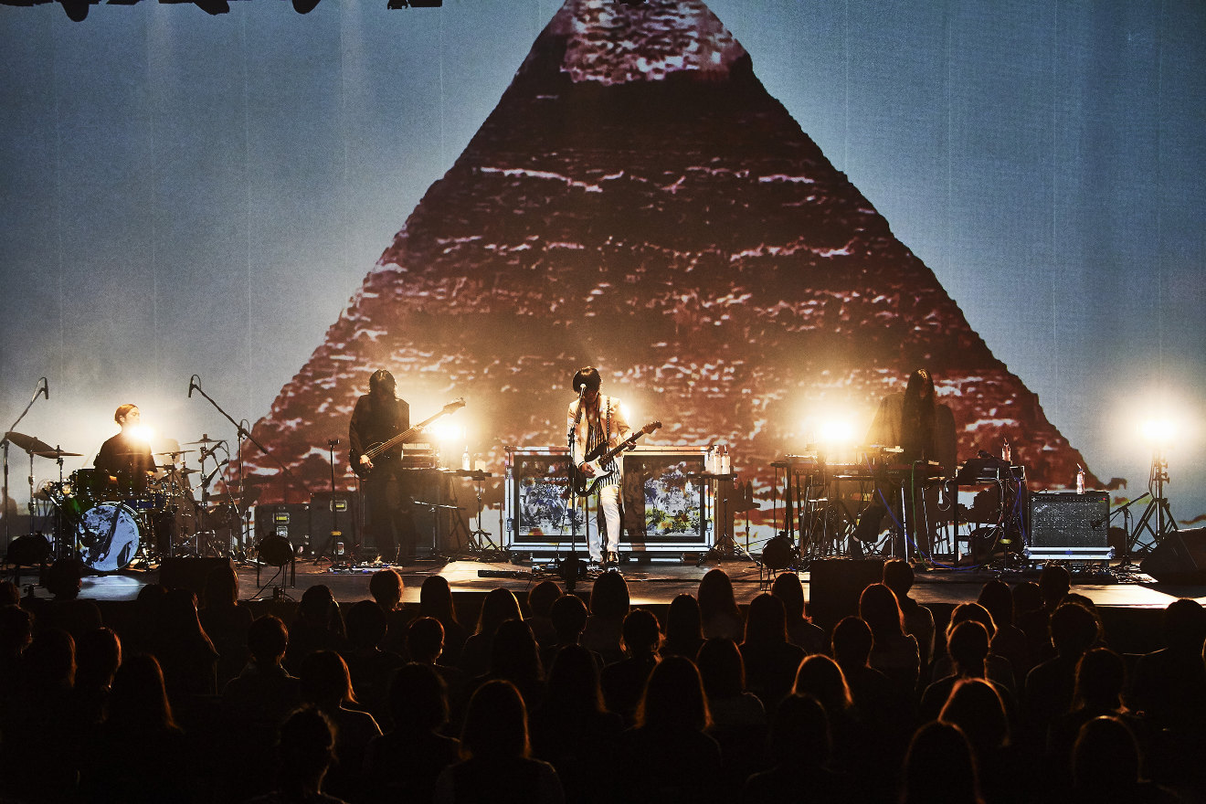 ライヴは終盤を迎え、バンドセッションへ。ピラミッドなどエジプトのモチーフが背後に映し出される中、妖しくエキゾティックなギター音階を奏でる圭。4人の音と音とがぶつかり合って次第にボルテージが昂っていき、圭は激しく頭を振って、弾くというよりもほとんど打ち鳴らすようにギターを鳴らし、音に没入していく。曲が終わらないうちに客席からは自然と興奮の拍手が沸き起こる、熱狂的な演奏だった。本編のラストは「eve.」。上述のイベント『Adam et Eve₋Adam₋』のために書き下ろした楽曲だ。花の蕾が開いたり風に揺れたりする映像には、走り去る電車も織り込まれていたのが印象的。全身全霊で鳴らすギターを鳴らす圭の姿からは、この現実世界を見つめ、生きとし生ける者の全てをあるがままに受け止める広い視座し、すべてを音楽に込めて届けようとする覚悟が感じられた。